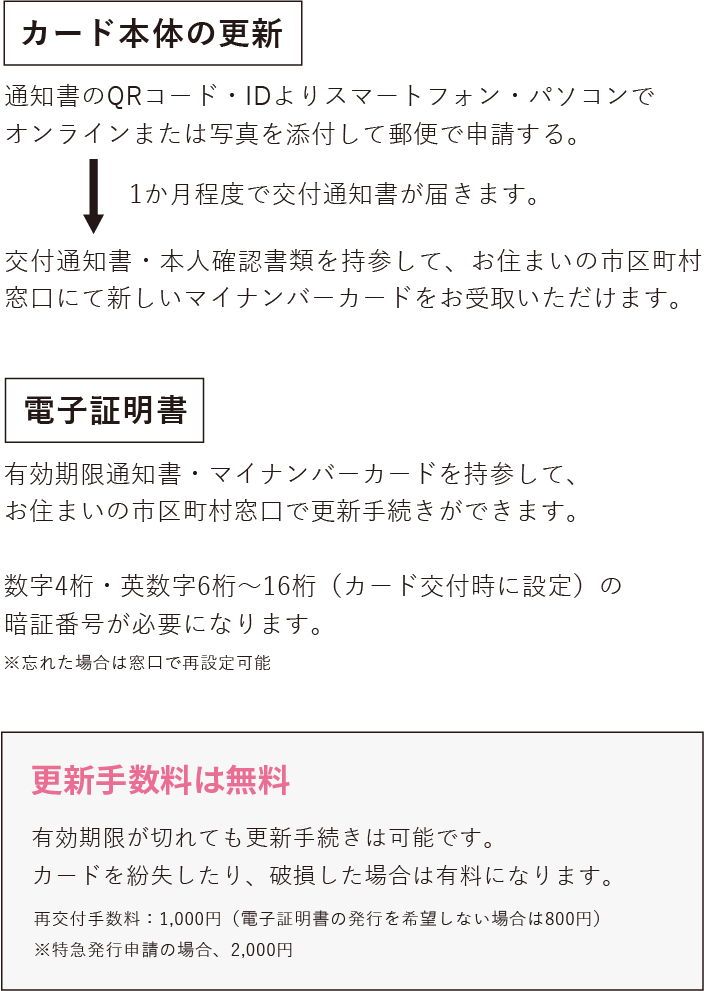 マイナンバーカードの有効期限マイナンバーカード普及の一環として始まった「マイナポイント事業」から、早くも5年が経ちました。その時期にカードを作成した多くの方が、今年、有効期限の更新を迎えています。マイナンバーカードには、カード本体と電子証明書の2種類の有効期限があり、それぞれ更新の手続きが必要です。今回は、更新の時期や手続きの方法、期限を過ぎたときの注意点をまとめました。