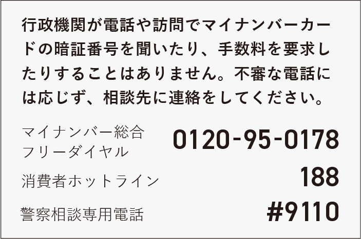 - 「代理で手続きする」と言ってマイナンバーカードと暗証番号を要求される。